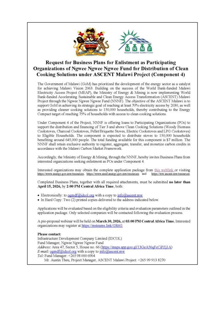 The Department of Energy Affairs-Malawi under the Ministry of Energy & Mining, through the Ngwee Ngwee Ngwee Fund (NNNF), invites interested organizations to submit business plans for enlistment as Participating Organizations (POs) to distribute and finance Tier 3 and above clean cooking solutions.